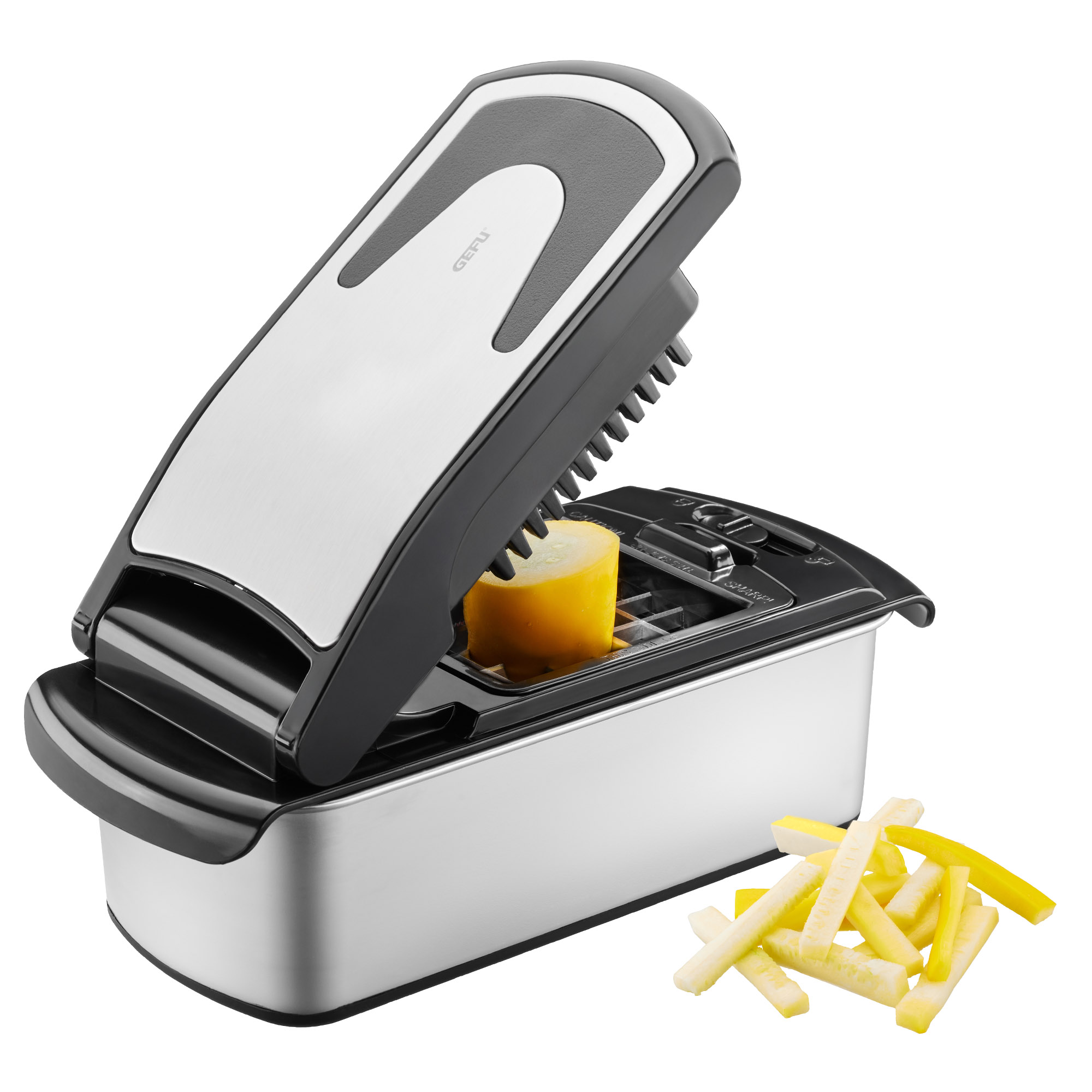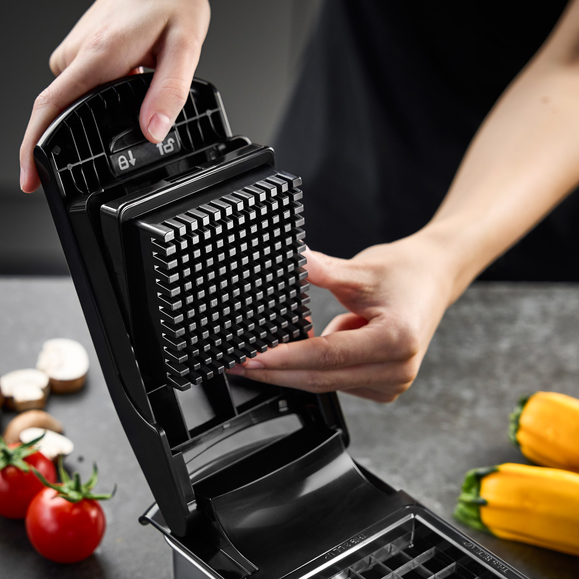 Avec la coupeuse de cubes et de bâtonnets, les légumes et les fruits peuvent être coupés en cubes, en bâtonnets ou en tranches en un tour de main - rapidement, confortablement et sans aucun effort.