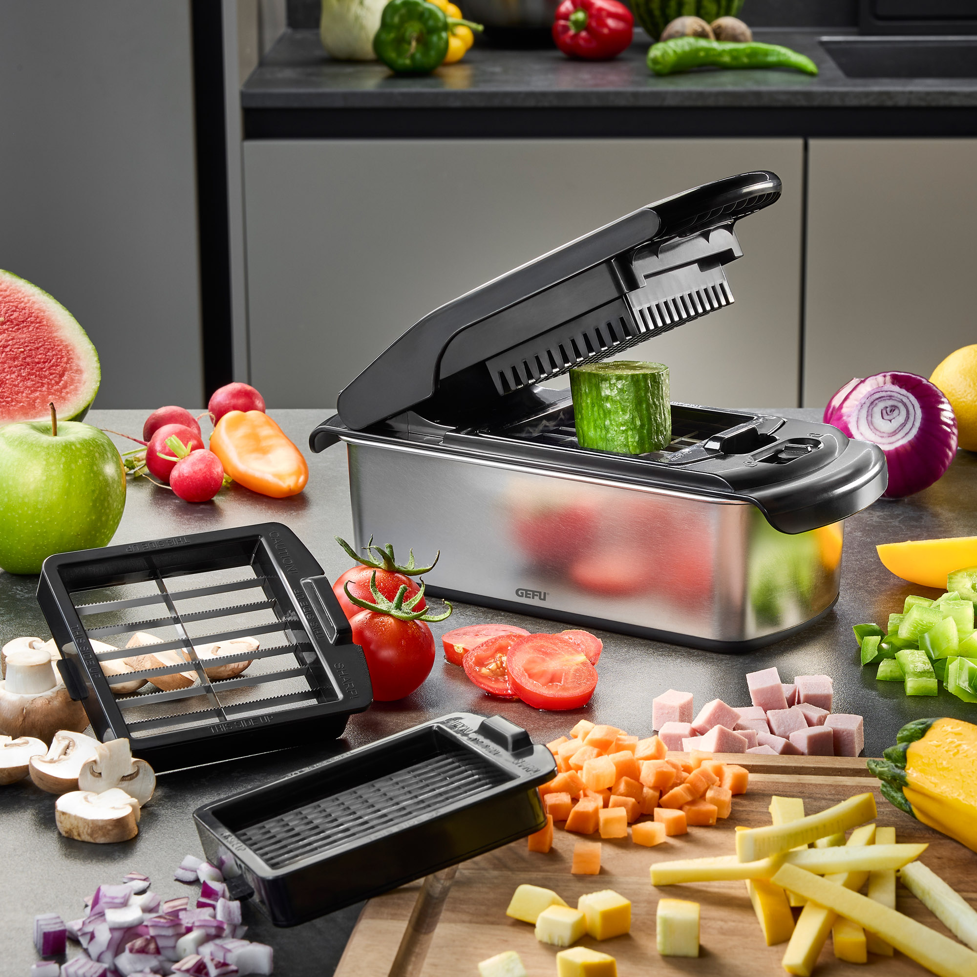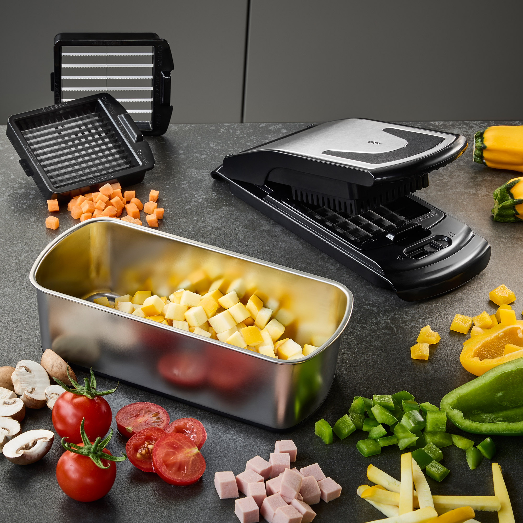 Qu'il s'agisse de cubes fins pour les crudités ou les potages, de gros morceaux pour les ragoûts savoureux ou de tranches régulières pour les salades et les gratins, tout est prêt en un clin d'œil.