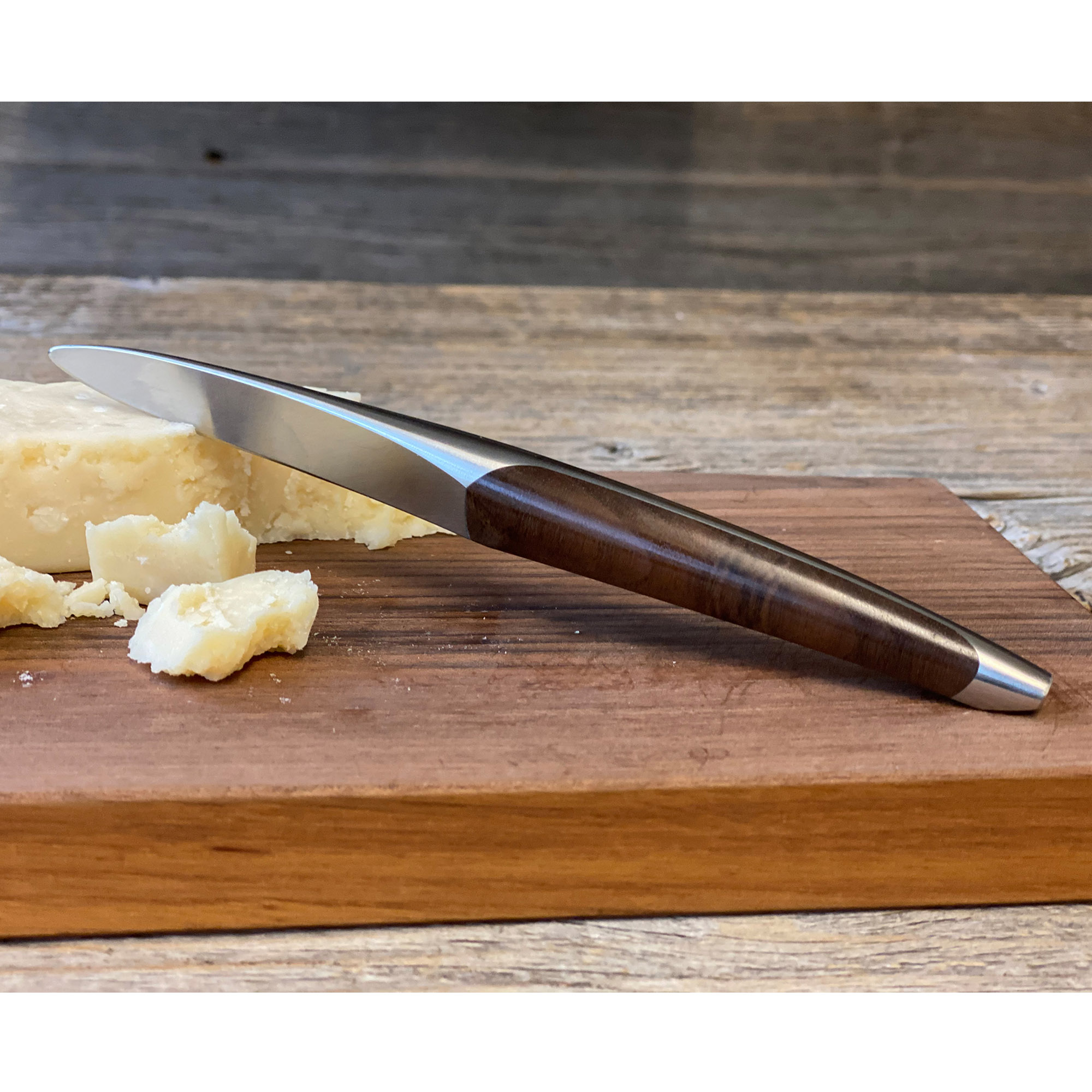 Le couteau à huîtres est forgé en Suisse dans un nouvel acier chirurgical d'une dureté de 58 HRC et d'une résistance à la corrosion quatre fois supérieure. Le manche est en bois de noyer stabilisé et la finition et la détente manuelle sont réalisées par le coutelier Hansjörg Kilchenmann à Bâle. La transition volontairement fluide entre le manche et la lame permet une coupe ergonomique et, fait unique, le bord de coupe n'est pas en contact avec la surface grâce à un design optimisé.