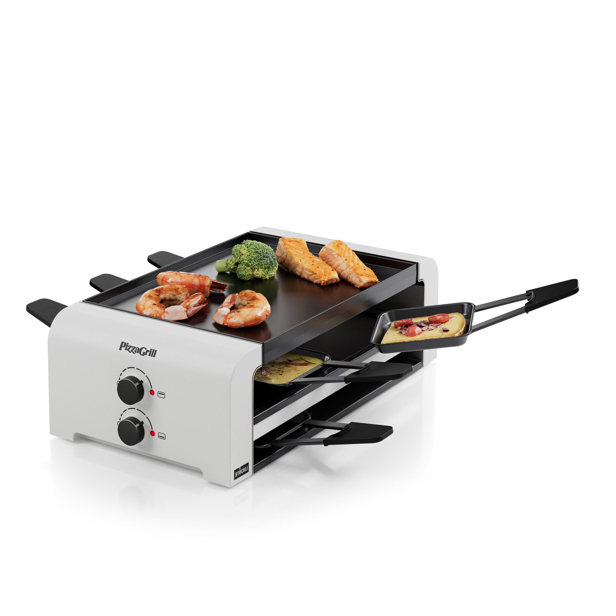 Le gril de table pour raclette et pizza ne séduit pas seulement par ses multiples possibilités d'utilisation, il est également équipé d'autres fonctions pratiques. Il dispose d'un régulateur pour la chaleur supérieure et inférieure, d'un réglage continu de la température, d'une plaque réversible pour le gril ou le teppanyaki et d'une surface de pose pour les poêlons pour une petite pause repas.