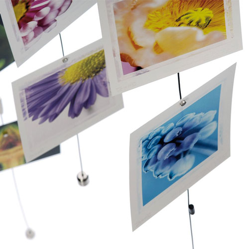 Ligne photo universelle en fil d'acier de 200 cm de long, avec 15 aimants librement positionnables et un poids en métal. Dans une boîte transparente avec une jolie carte postale assortie