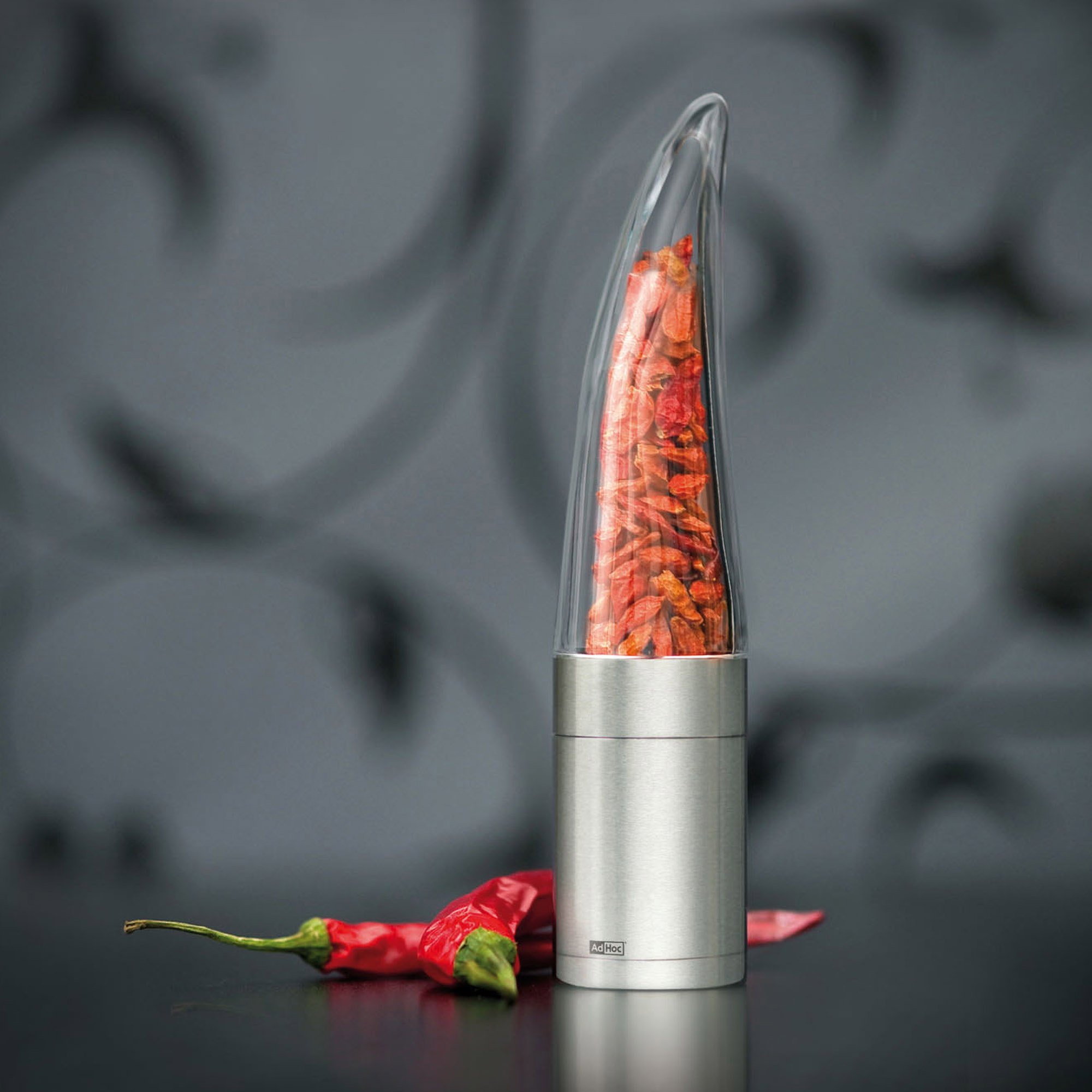 Le moulin repose merveilleusement dans la main. De plus, il impressionne par son design inhabituel et élégant en acier inoxydable acrylique, dans lequel le récipient en plastique transparent permet de voir les piments et l'épice elle-même devient un véritable eye-catcher sur votre table