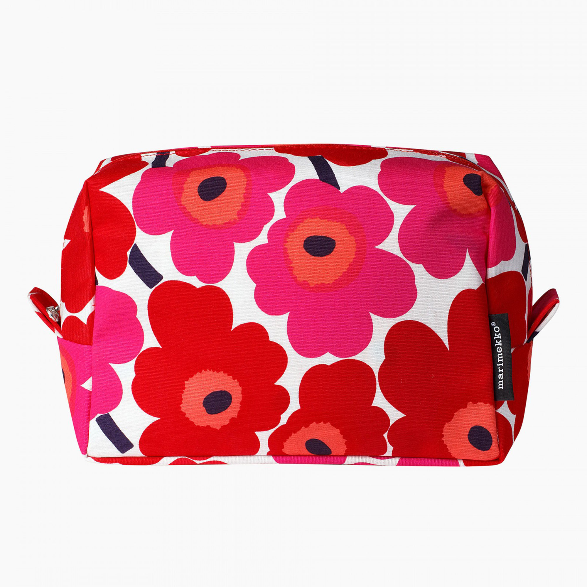 La trousse de toilette Unikko a la taille parfaite pour les shampooings et les gels douche. L'intérieur est recouvert de PVC, ce qui le rend facile à nettoyer. La trousse de toilette comporte en outre deux poches latérales dans lesquelles on peut ranger de petits ustensiles. La trousse de toilette est décorée du motif classique Unikko de Maija Isola.