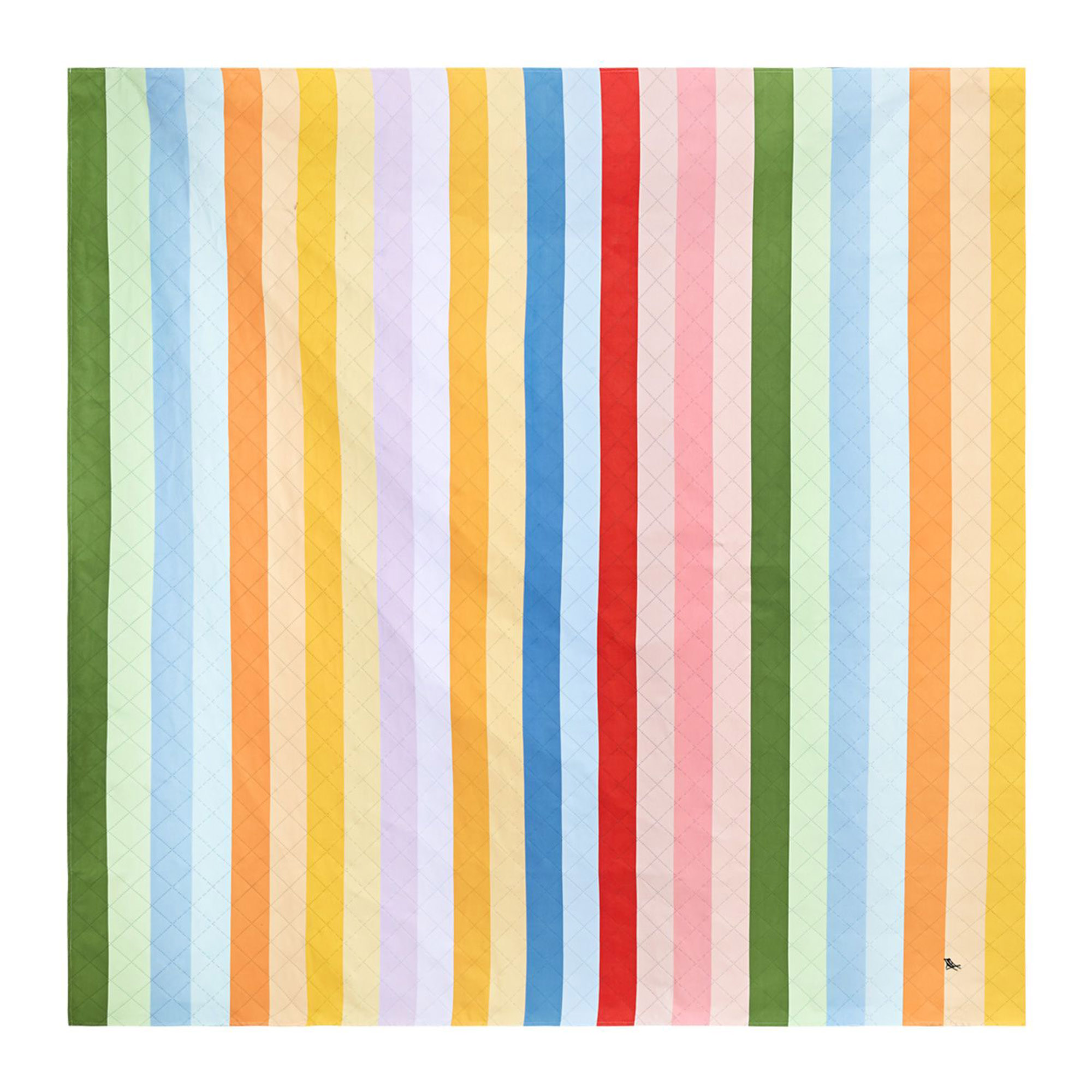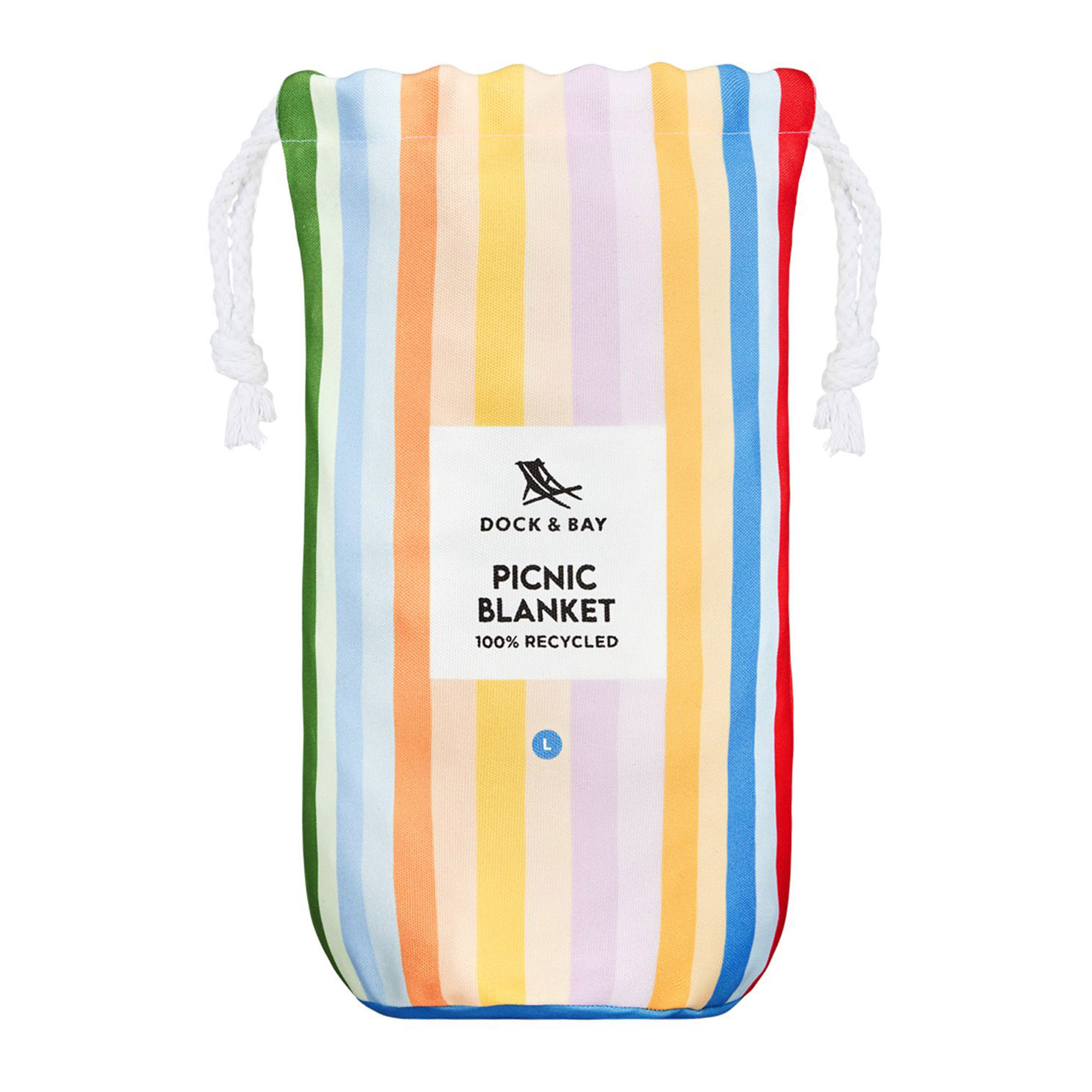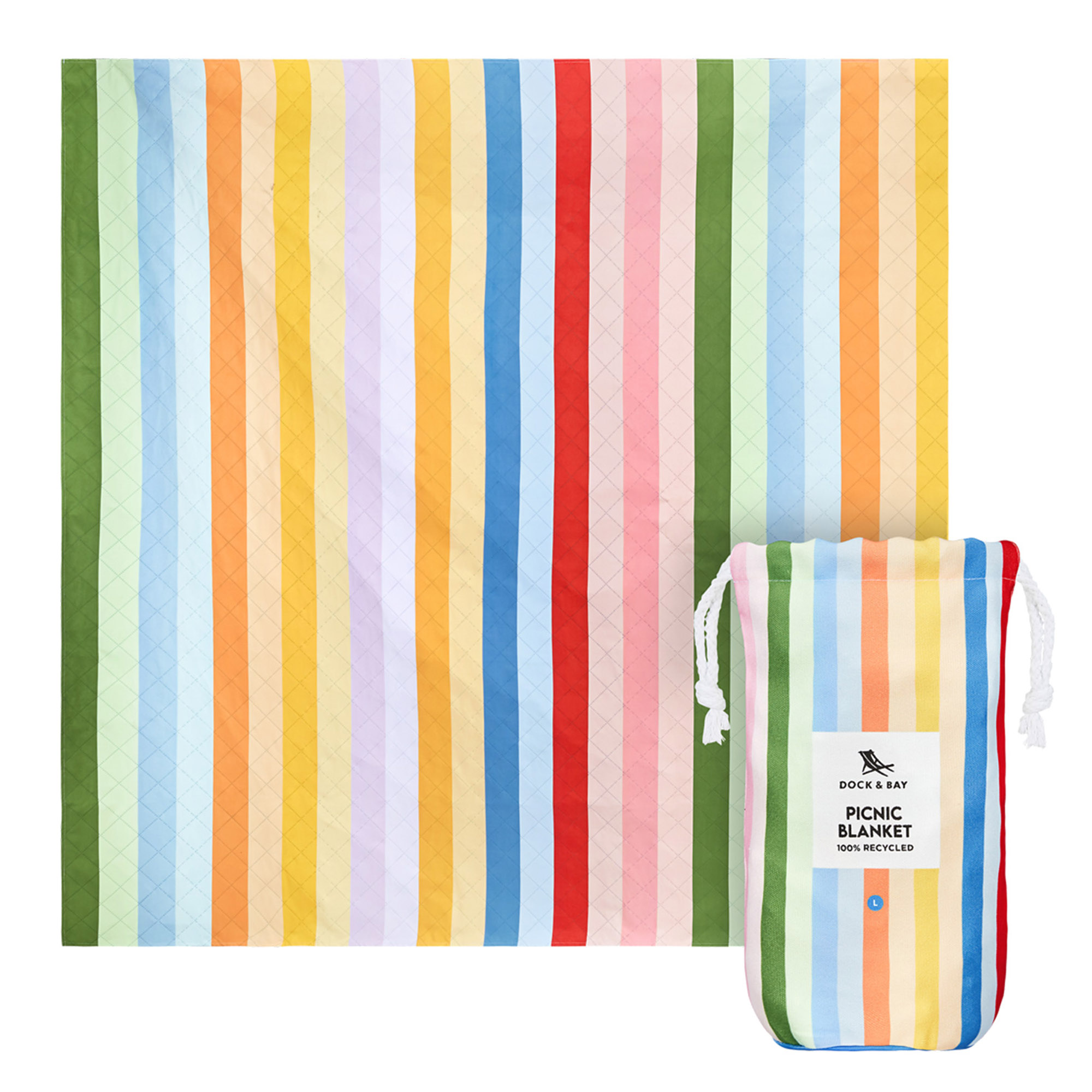 Die bunt gestreifte Picknick-Decke ist leicht, schnelltrocknend, sehr saugfähig und nimmt keine feuchten Gerüche auf.
