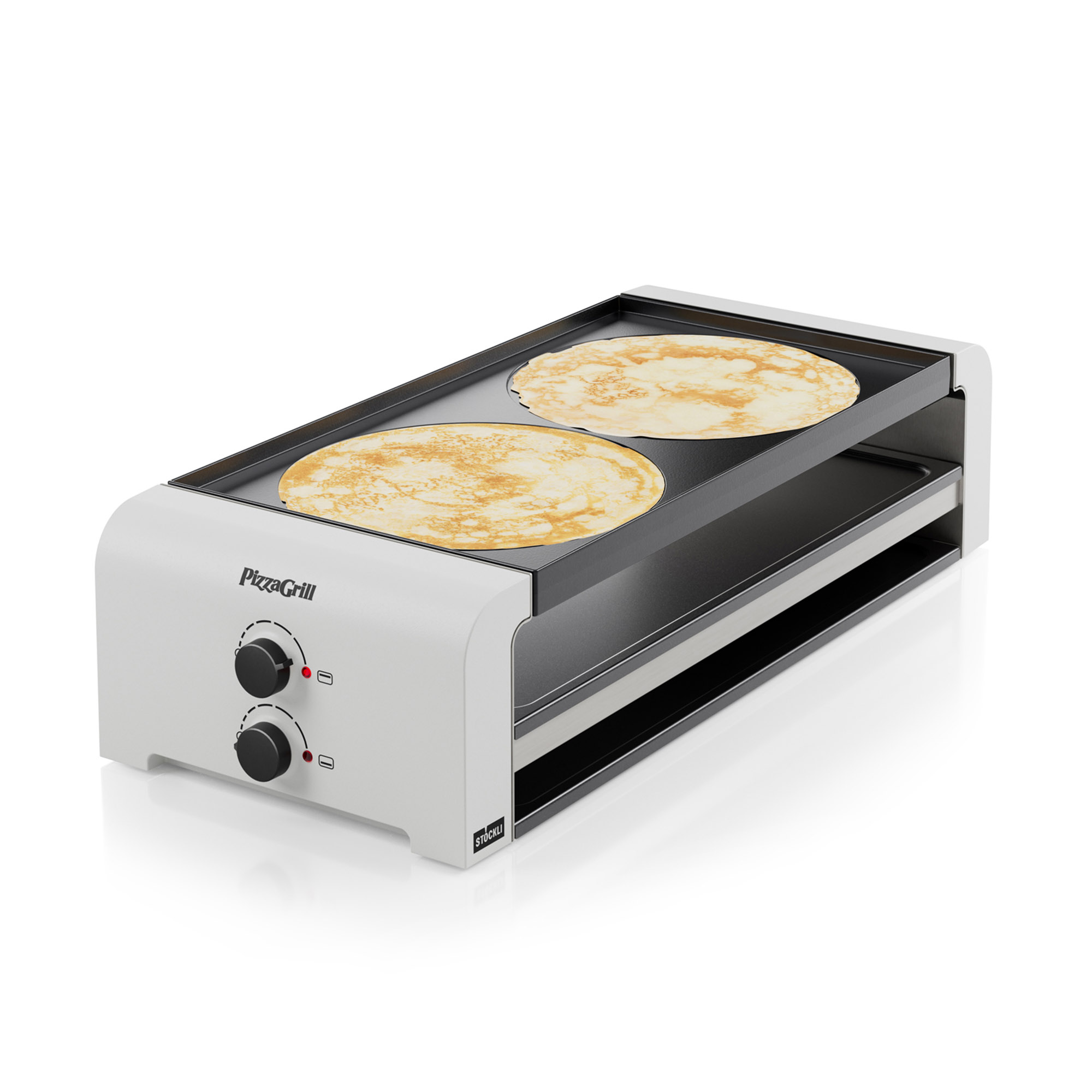 Avec cette plaque, le raclette-grill peut également être utilisé pour la préparation de crêpes ou de galettes. Deux grandes crêpes ou galettes peuvent être préparées sur un côté et six petites sur l'autre.