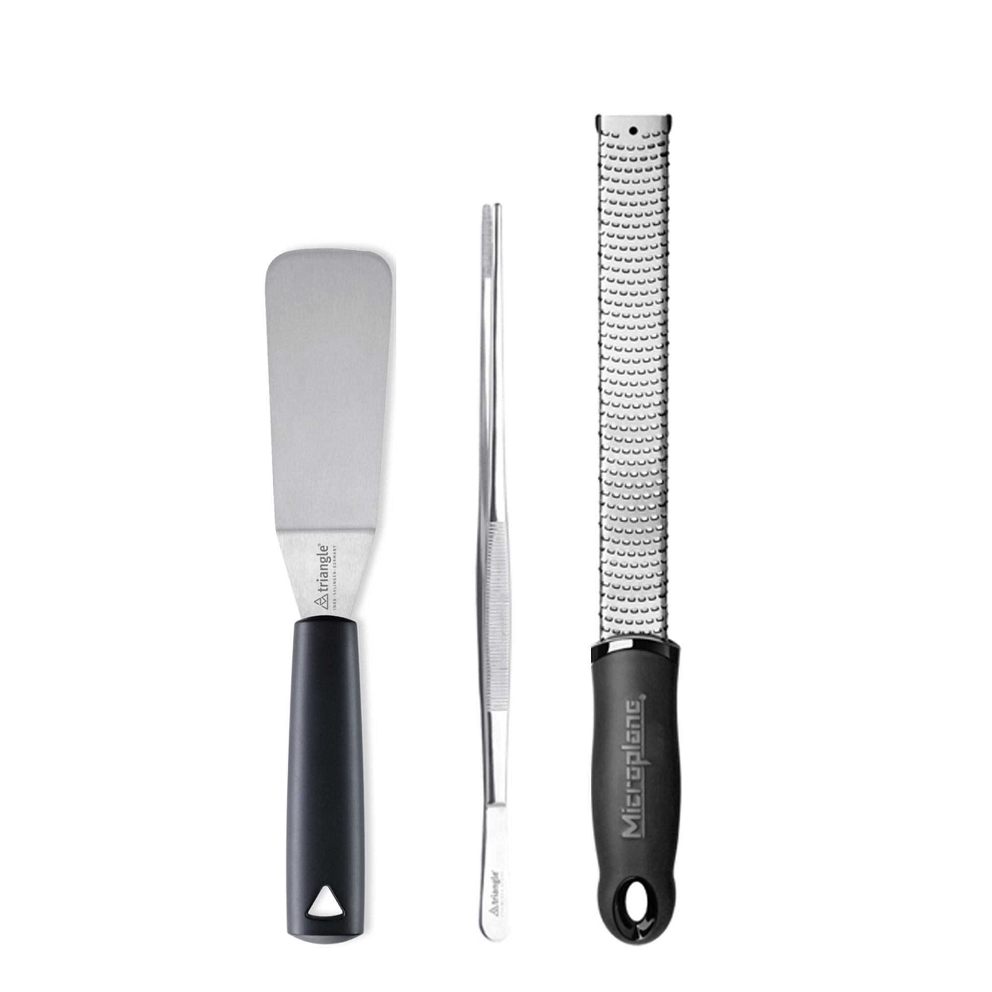 - Set de garniture triangulaire 7 pièces ; éplucheur, rouleau à beurre, 2 emporte-pièces boule 10 et 30 mm, emporte-pièce, couteau à ciseler et ester dans son propre sachet de rouleau