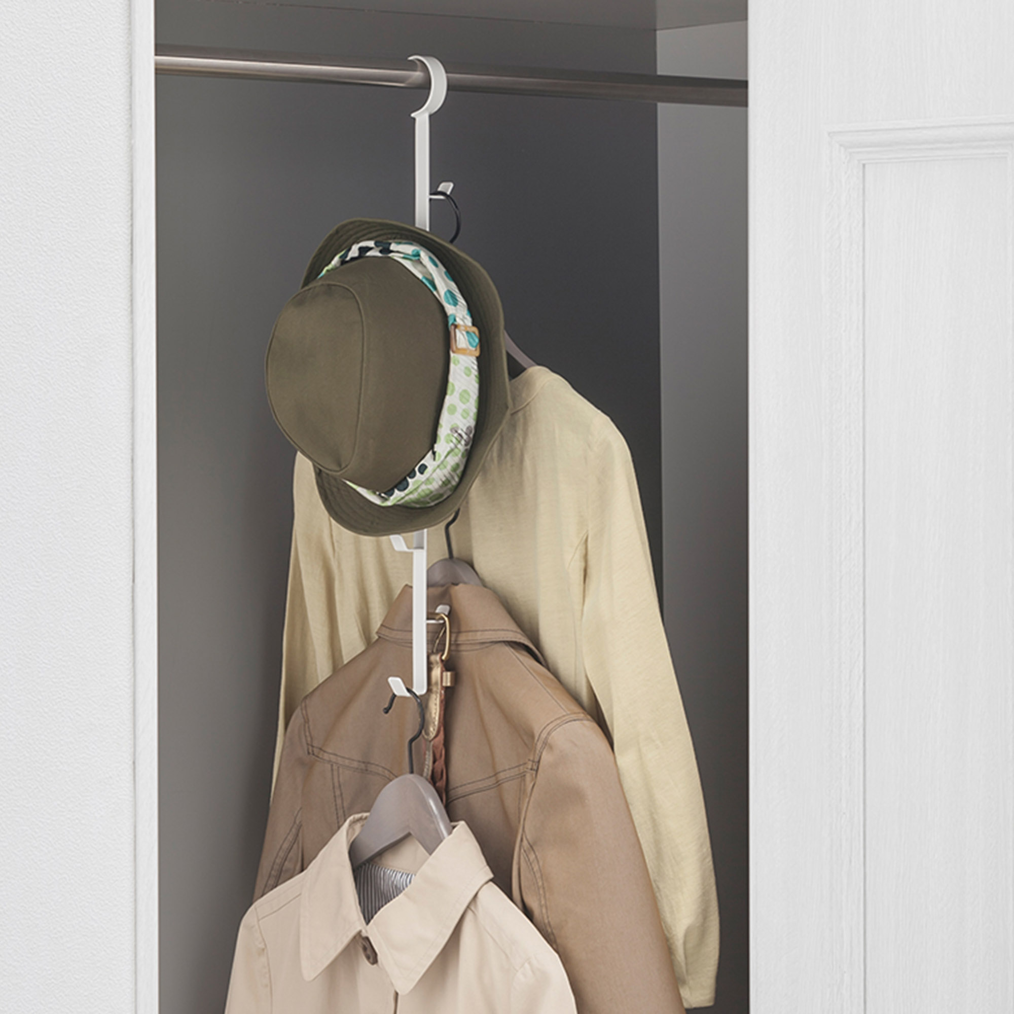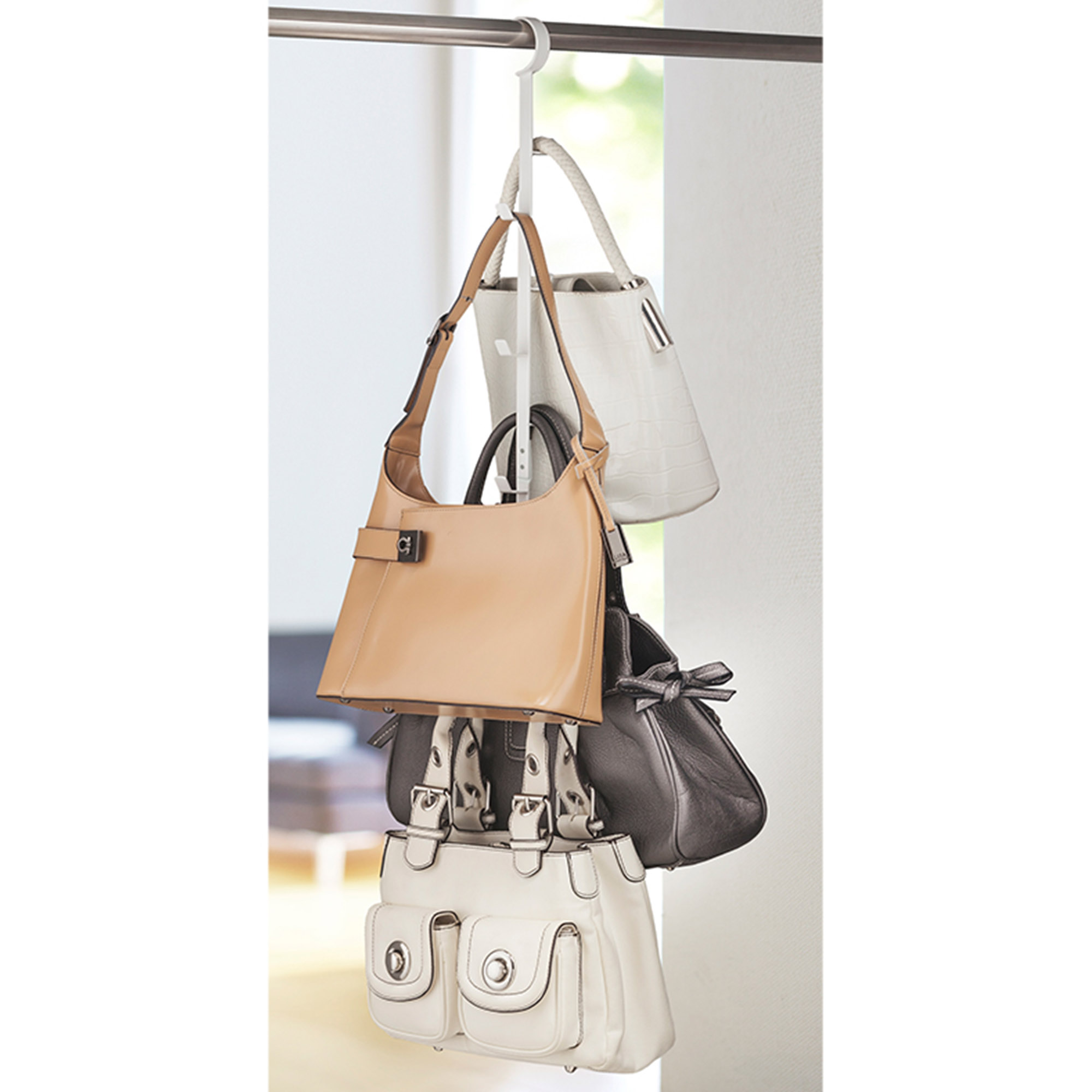 Une manière astucieuse de ranger les sacs à main ou même les vêtements dans l'armoire. Il suffit de les accrocher au rail pour créer plus d'espace de rangement