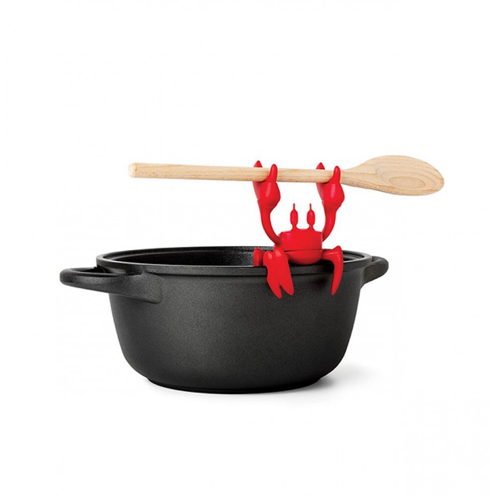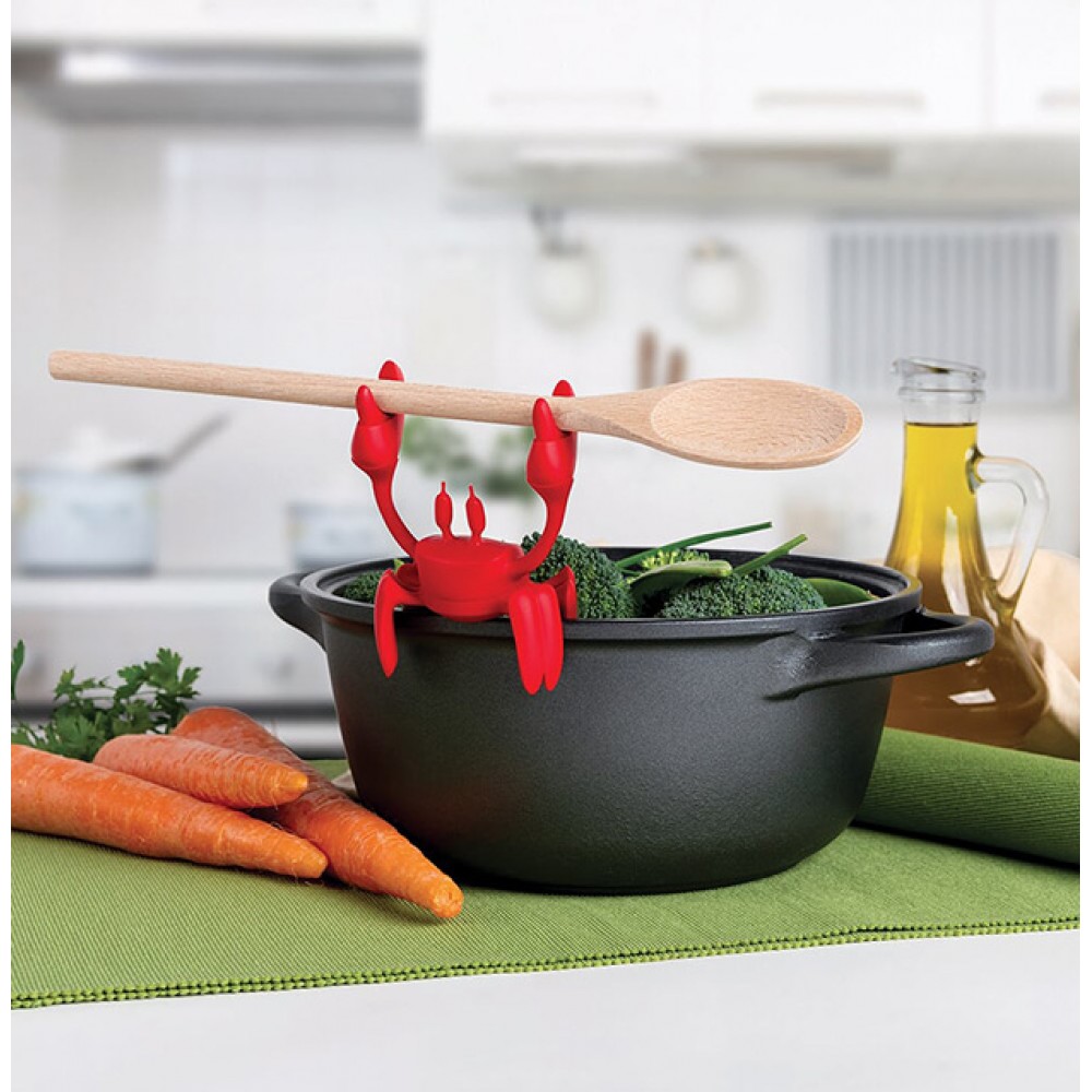 Le petit crabe n'a pas sa place dans la casserole, mais plutôt sur ou à côté de la casserole. Car il est un petit assistant pour cuisiner. Avec ses deux pinces, il tient fermement la cuillère de cuisine, de sorte que la cuillère ne salisse pas le plan de travail.
