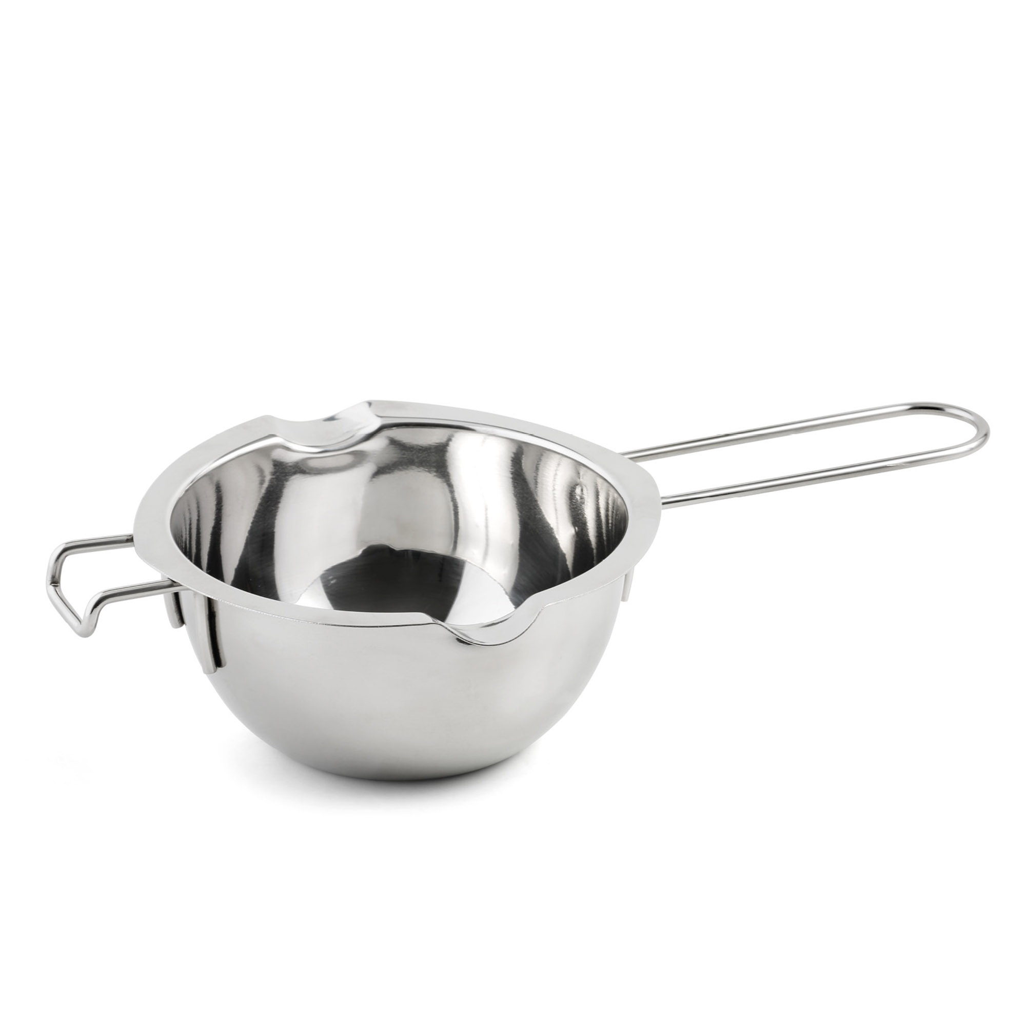 Mit der Schmelzschale können Schokolade, Butter und andere Lebensmittel schonend über einem Wasserbad geschmolzen oder erwärmt werden. Der Schmelzer verfügt über zwei unterschiedlich grosse Giessränder für komfortables und präzises Arbeiten und ist vollständig aus hochwertigem Edelstahl gefertigt.