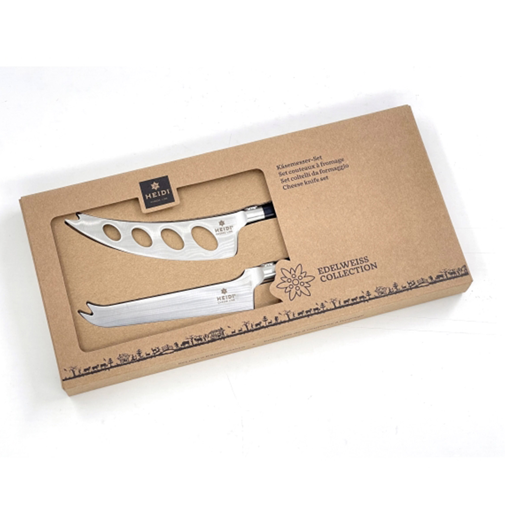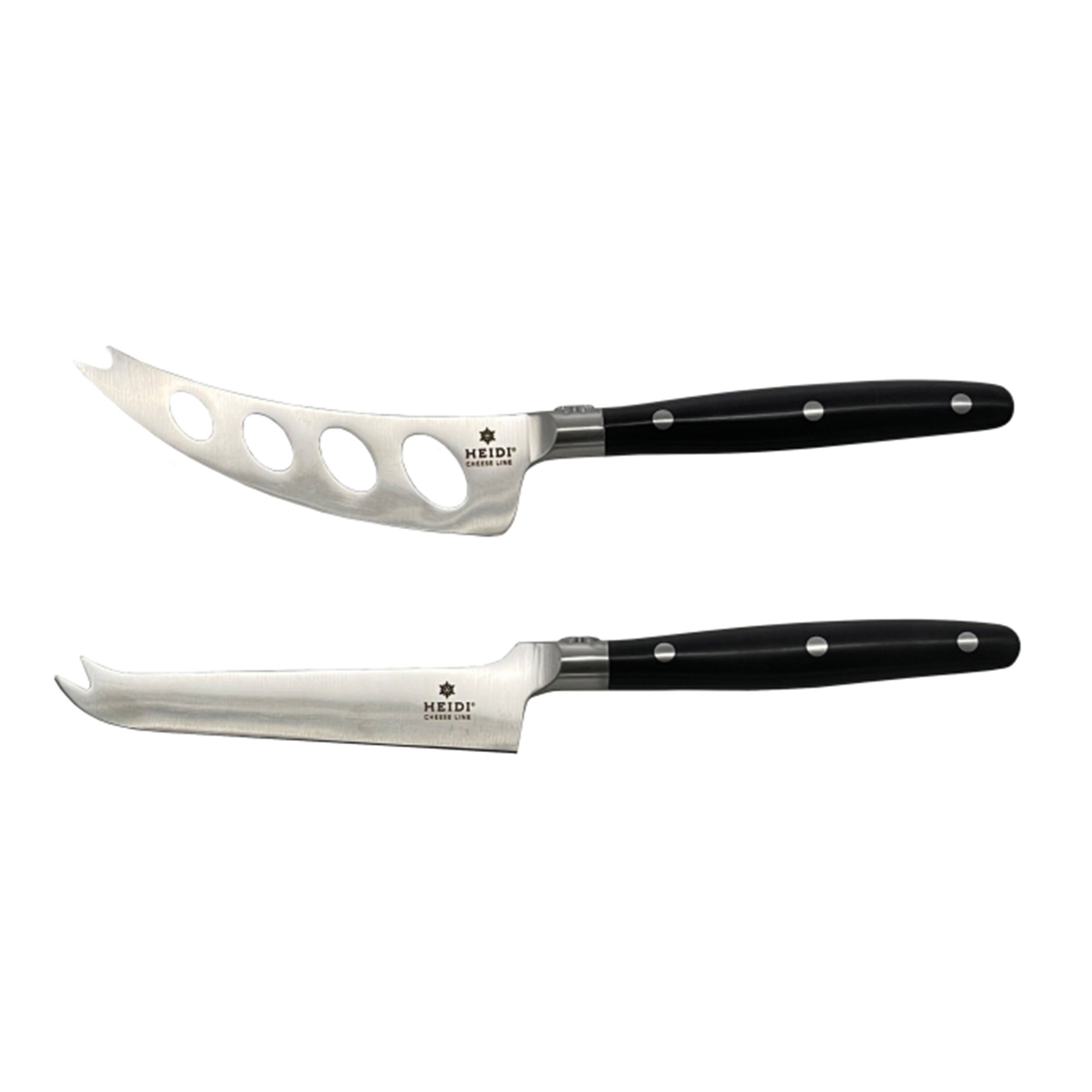 Le set de couteaux à fromage Heidi se compose d'un couteau à fromage à pâte molle et d'un couteau à fromage à pâte dure. Il est donc le compagnon idéal de vos fromages préférés. Le manche est en ABS noir et est maintenu par 3 rivets métalliques. La mitre du couteau est décorée d'un relief d'edelweiss, le motif caractéristique de la marque Heidi.