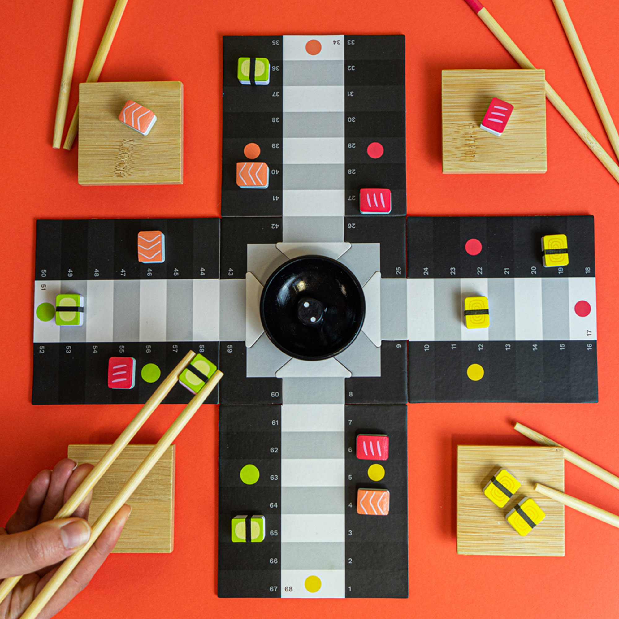 Le jeu "Les hommes ne s'embêtent pas" Ludo-Sushi au design japonais. Qui gagnera ? Le joueur avec le nigiri sushi aux œufs, au thon, au saumon ou à l'avocat ? Ou plutôt : qui s'énerve contre qui à la fin, car le jeu est également connu sous le nom de "Mensch ärgere Dich nicht". Le plateau de jeu amusant assure en tout cas le divertissement et le plaisir.