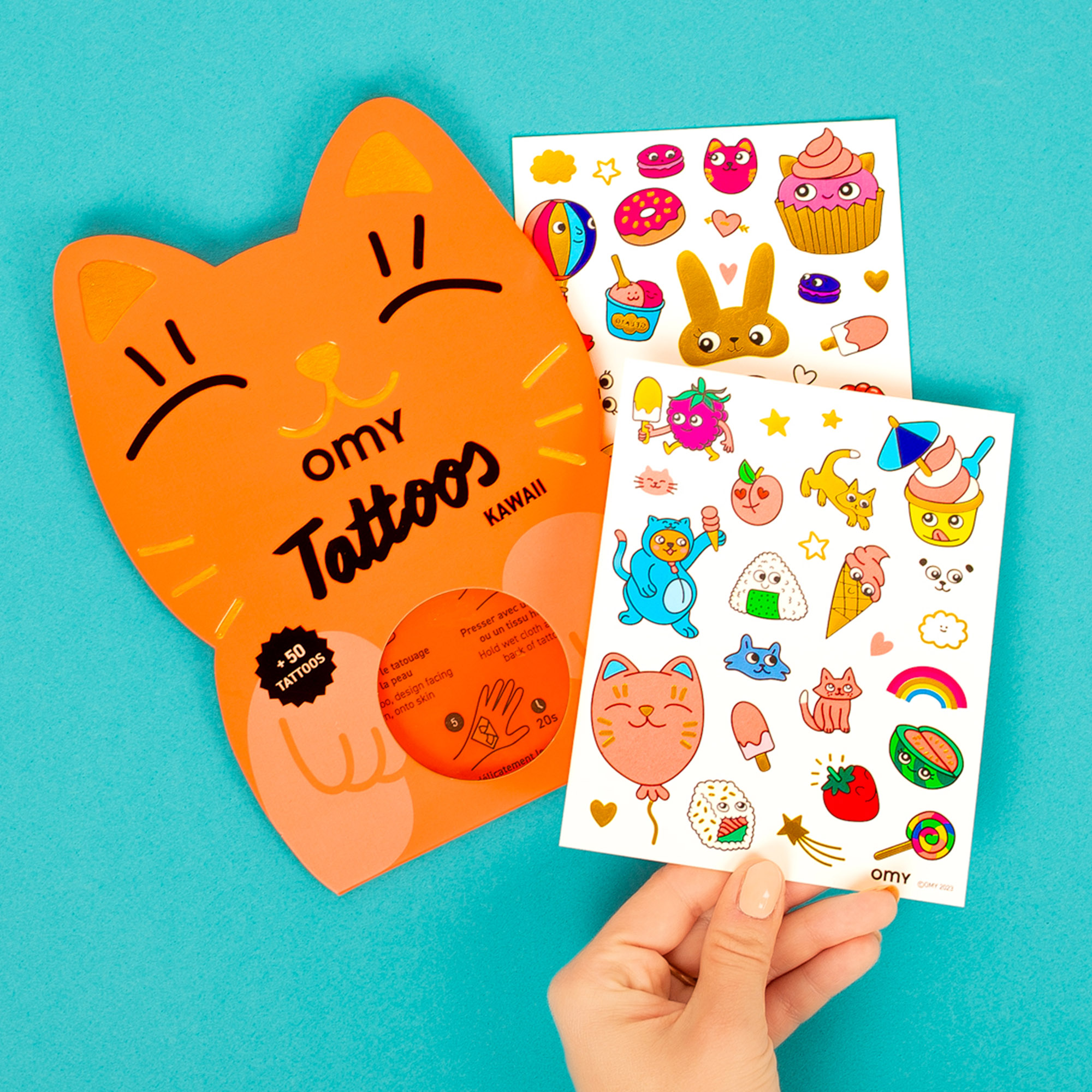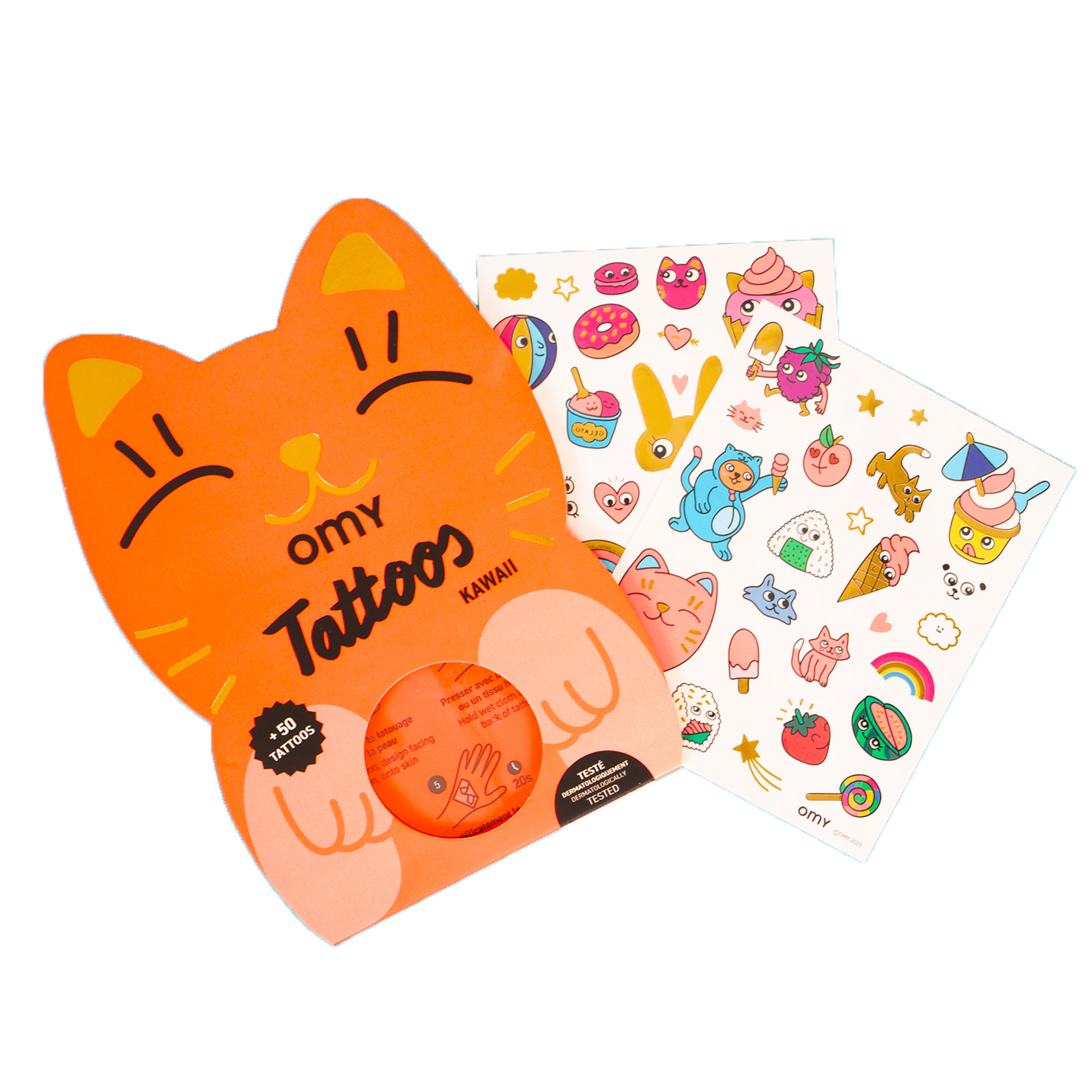 Des motifs sympas comme les chats, les fruits, la crème glacée et les étoiles invitent les enfants à décorer leur peau de manière créative. Les tatouages temporaires sont faciles à appliquer : Coller sur la peau, humidifier avec de l'eau et presser brièvement. Il en résulte un tatouage vivant et coloré qui dure plusieurs jours et qui peut être facilement nettoyé si nécessaire.
